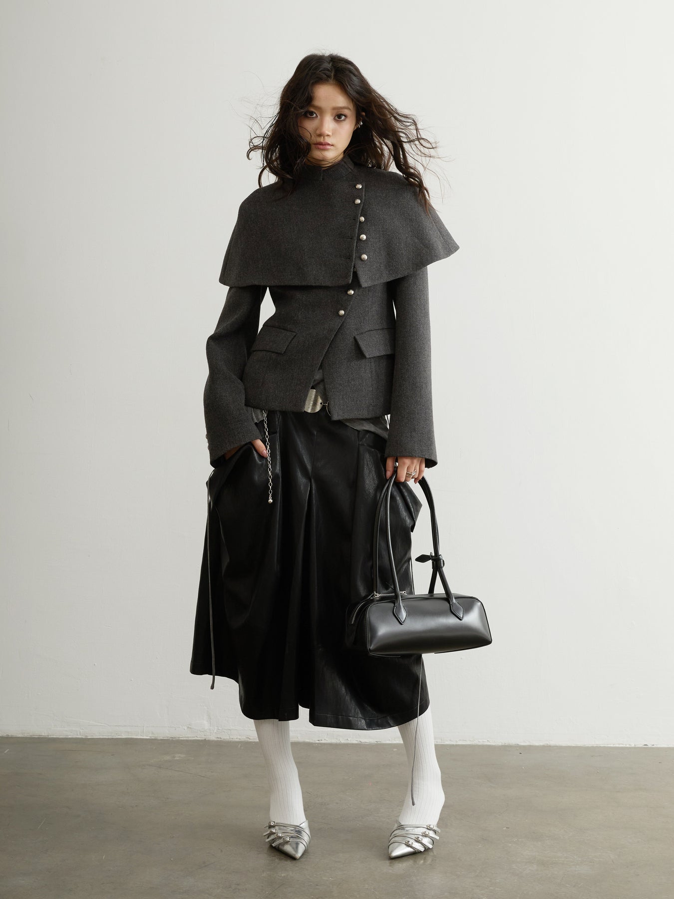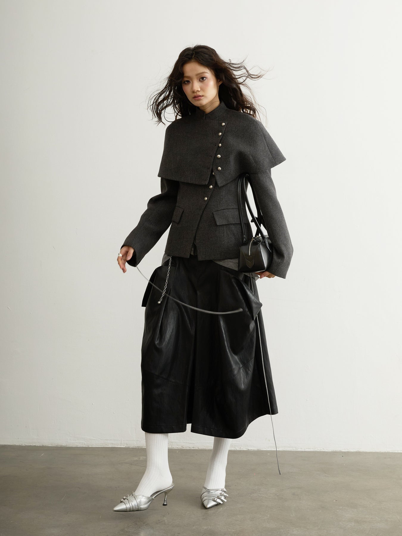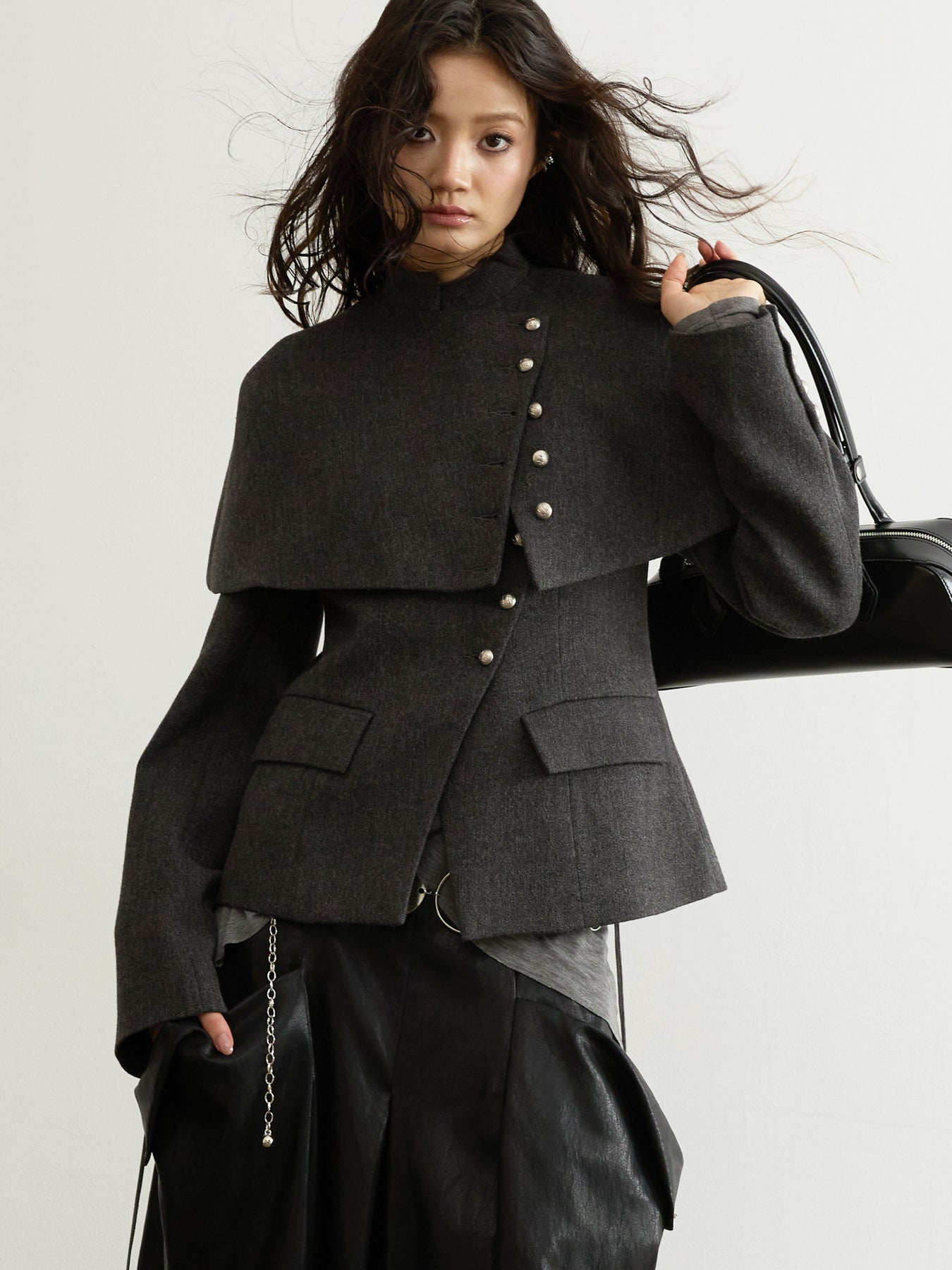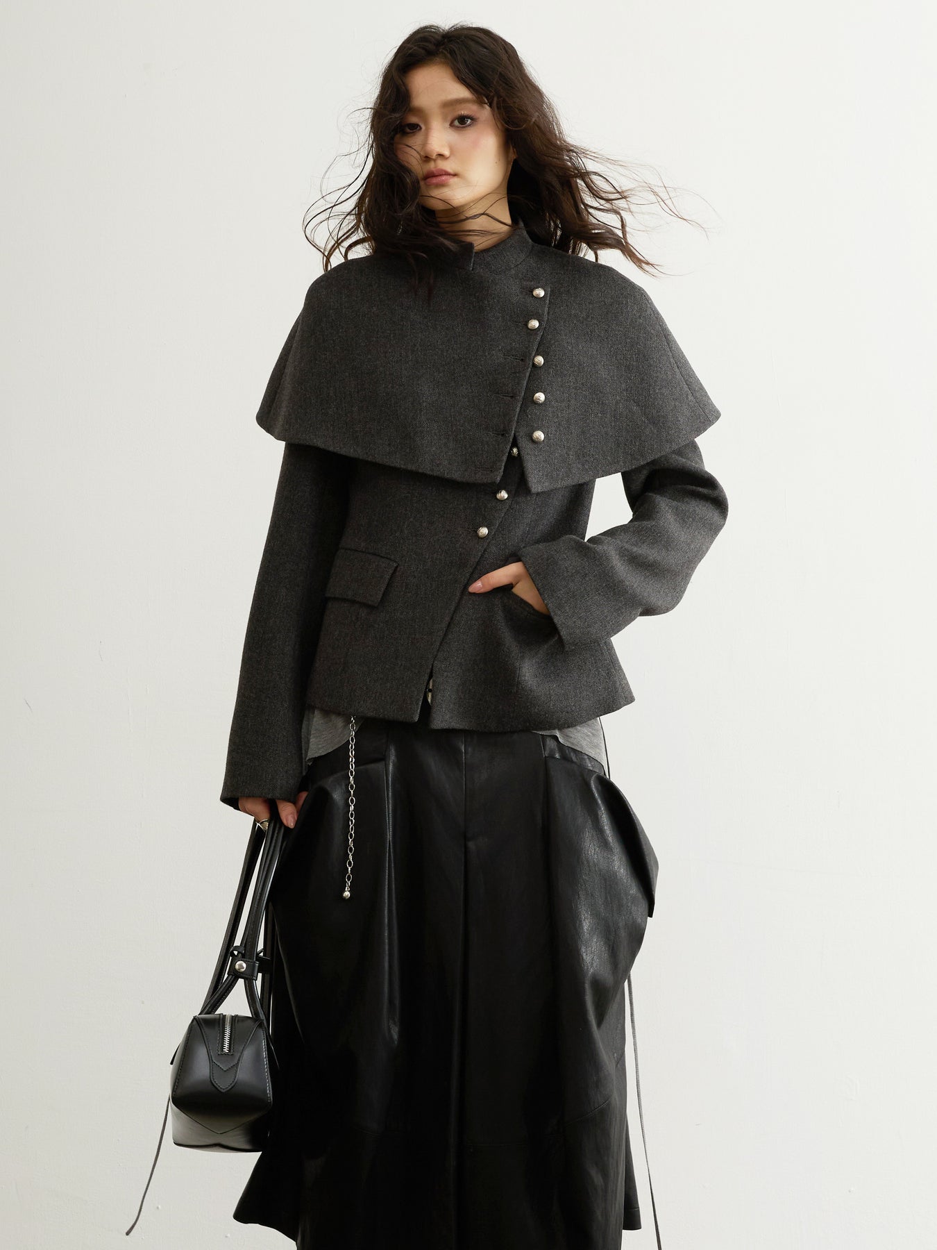 Dark Grey Wool Detachable Cape Jacket JNY0294