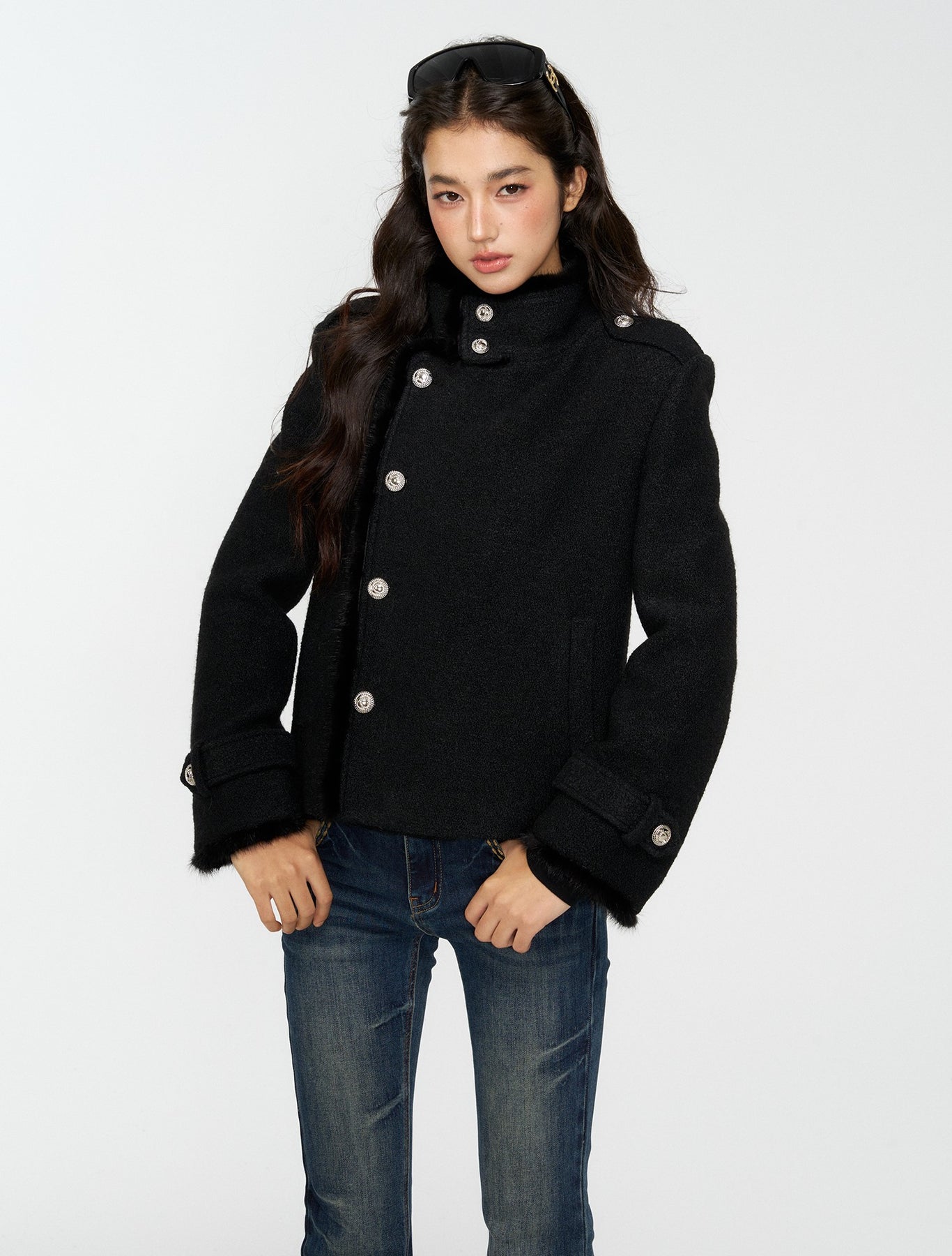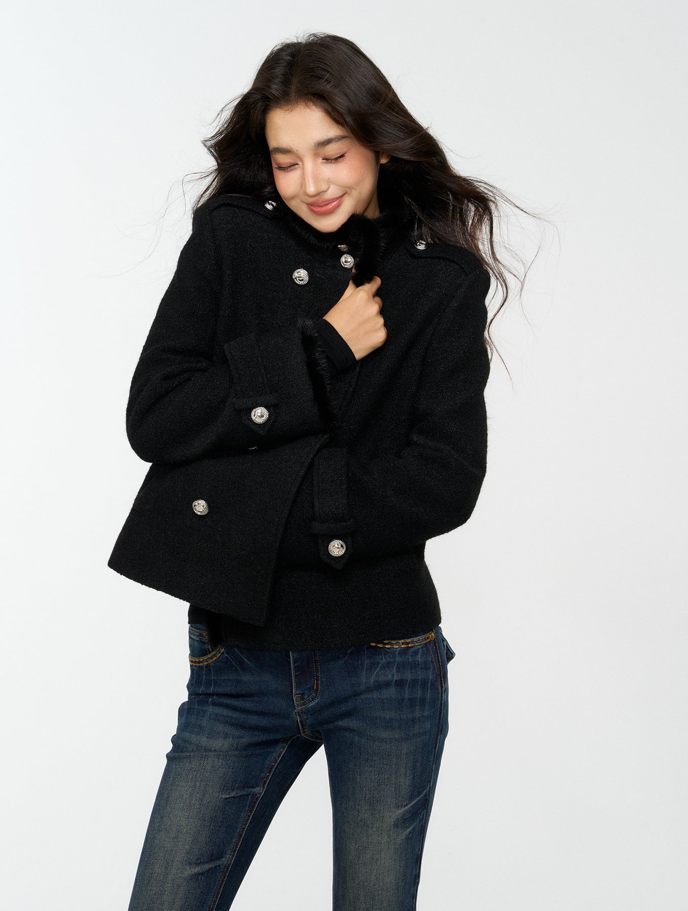 Black Furry High-Neck Short Jacket/Scarf 4MU0165