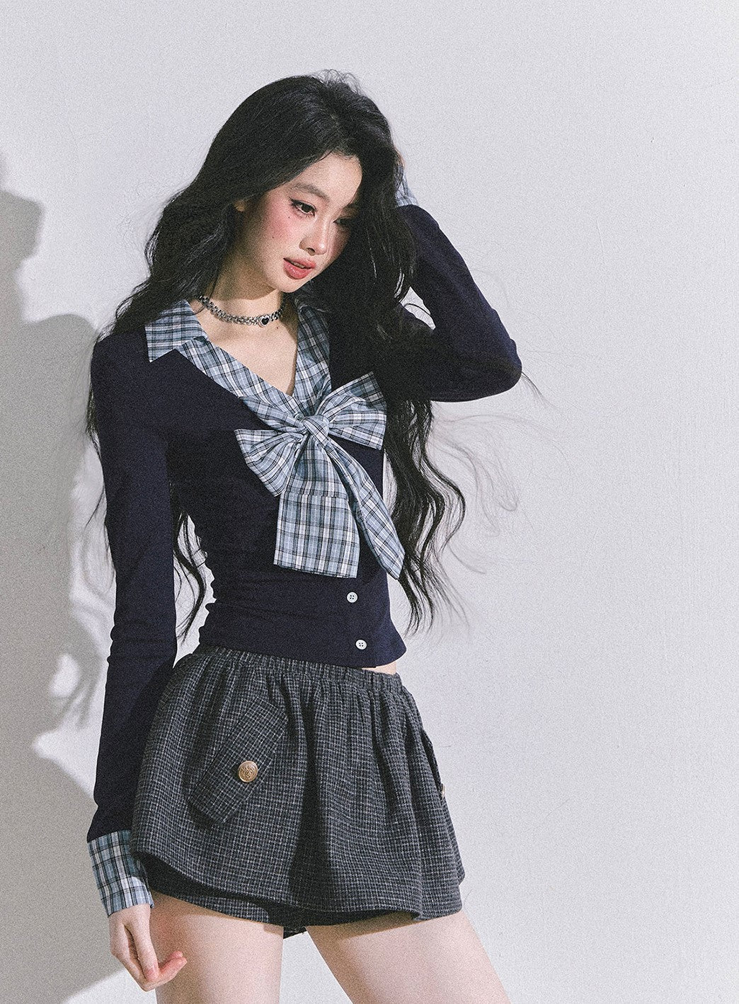 Fake Two-piece Bow Plaid Shirt DIA0599
